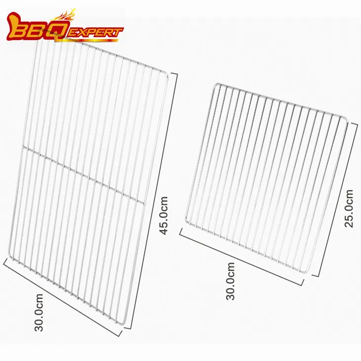 Det är mor-son design. Den stora grillen är 45x30cm medan den lilla är 25x30cm. Mat kan rostas direkt på grillarna. S/S-material och bra utförande gör grillen säker.